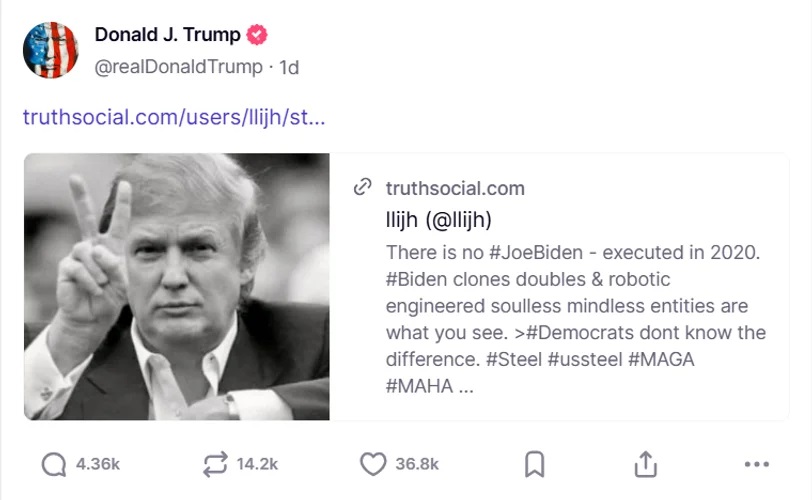 Действующий президент США Дональд Трамп разместил на своей платформе Truth Social сообщение о том, что Джо Байдена "казнили" еще в 2020 году, заменив его клоном или роботом, пишет NBC News.