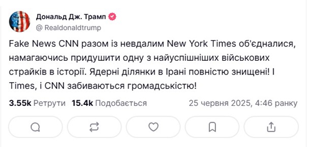 Телеканал CNN и издание New York Times опубликовали материалы, в которых сообщается, что во время атаки США ядерные объекты Ирана не были уничтожены. Президент США Дональд Трамп в своей соцсети Truth Social уже ответил СМИ, что эти новости «фейковые».