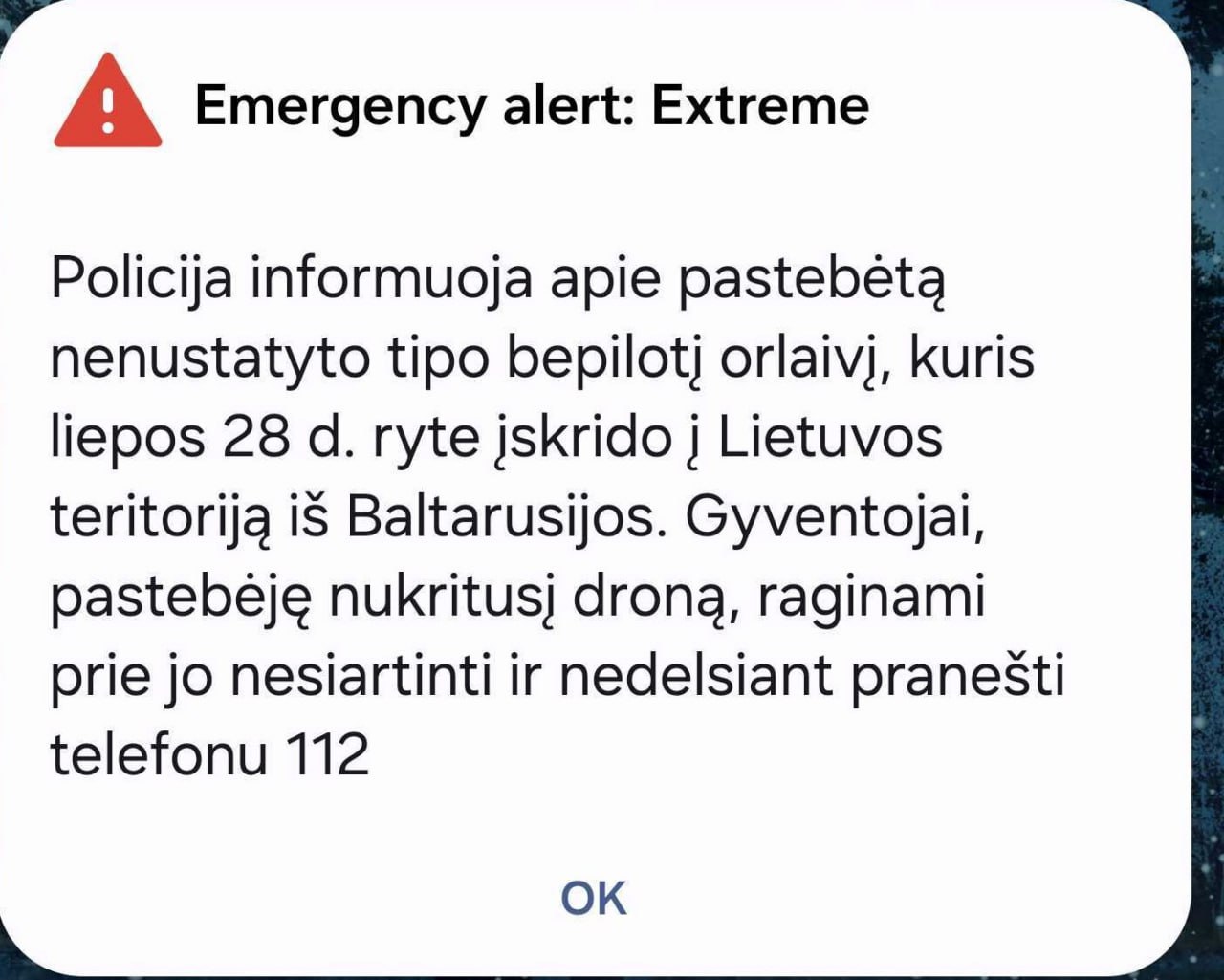 В заявлении Национального центра управления в кризисных ситуациях, которое цитирует телерадиокомпания LRT, говорится, что, “согласно полученным сообщениям, дрон был замечен на высоте около 200 метров, последний раз его видели недалеко от Вильнюса”.