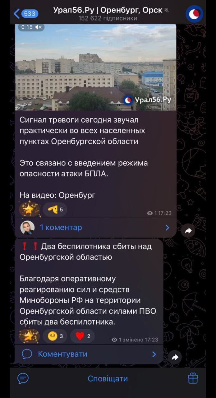 Минобороны России заявляло о "перехвате и уничтожении" трех беспилотников над территорией Оренбургской области. Временно исполняющий обязанности губернатора Оренбургской области Евгений Солнцев сообщал, что в регионе включали сигнал «Воздушная тревога».