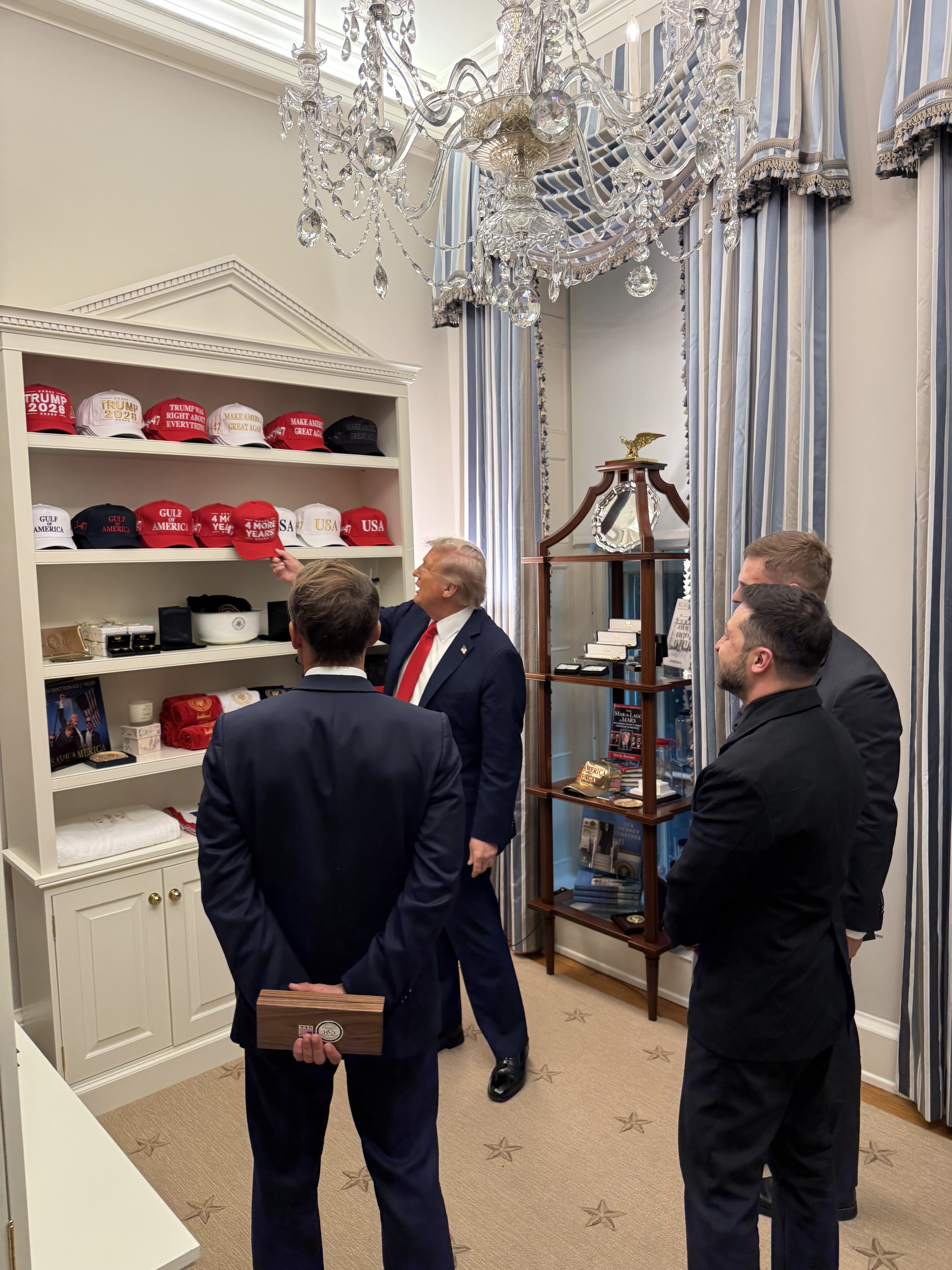 На опубликованном фото можно увидеть другие кепки Трампа с надписями «Трамп 2028», «Сделаем Америку снова великой», «Трамп был во всем прав», «Американский залив» и «США». На фотографии видно, что Зеленский улыбается, а вот реакция Макрона осталась неизвестной, потому что он стоит спиной.