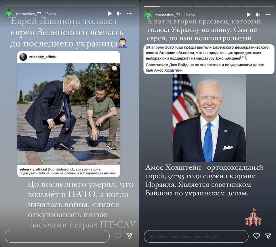 Также в сеть выложили скриншоты старых сторис, которые можно воспринимать как проявление антисемитизма Мамешева. В частности, он пишет о «еврее Джонсоне, который толкает еврея Зеленского воевать до последнего украинца» и публикует списки евреев среди американских властей.