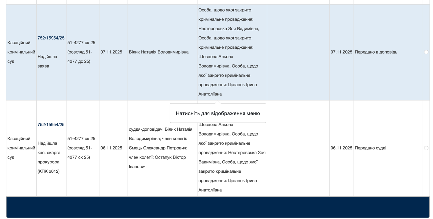 Кассационный уголовный суд рассмотрит кассационную жалобу Офиса Генерального прокурора на решение о закрытии уголовного производства об отмывании средств через Айбокс банк в отношении Алены Шевцовой и ее сообщниц Зои Нестеровской и Ирины Цыганок. Пока материалы дела 752/15954/25 переданы для доклада судьи Натальи Билык.