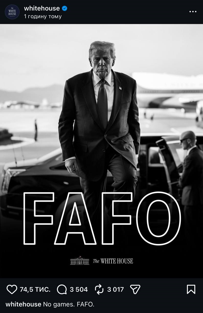 Официальный аккаунт Белого дома отреагировал на успешную операцию в Каракасе и задержание Николаса Мадуро лаконичным, но провокационным сообщением. Он опубликовал черно-белое фото президента Дональда Трампа с англоязычной аббревиатурой FAFO, расшифровывающейся как fuck around and find out.