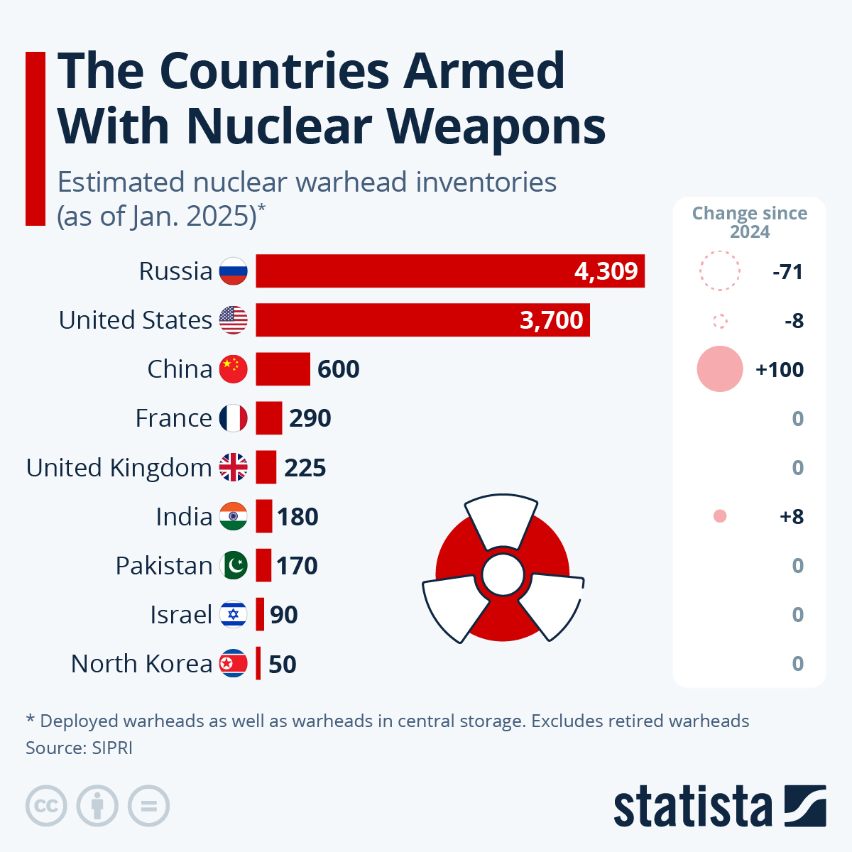 Данные на 2025 год. 80% ядерных арсеналов принадлежат США и России, но активно увеличивает количество Китай