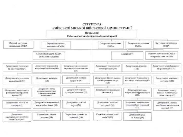 Глава Киевской городской военной администрации Тимур Ткаченко утвердил новую организационную структуру и штатное расписание КГВА. Документ определяет лиц, отвечающих за конкретные направления работы в столице. Об этом он сообщил на своем Telegram-канале.