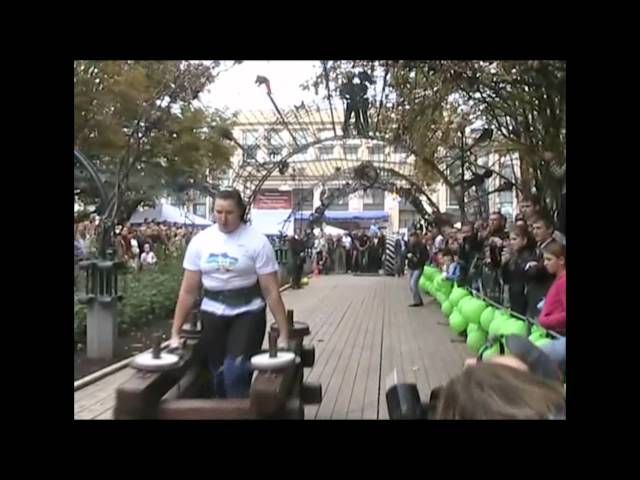 Вообще-то рекордов должно было быть три, но выступая в Донецке на пределе возможности, девушка-богатырь Нина Геря не справилась с последним испытанием. Железное "коромысло" весом 350 килограммов, которое с трудом поднимали пятеро здоровых мужиков, она пронесла не 25, а 20 метров, да и в положенное время ей уложиться не удалось.