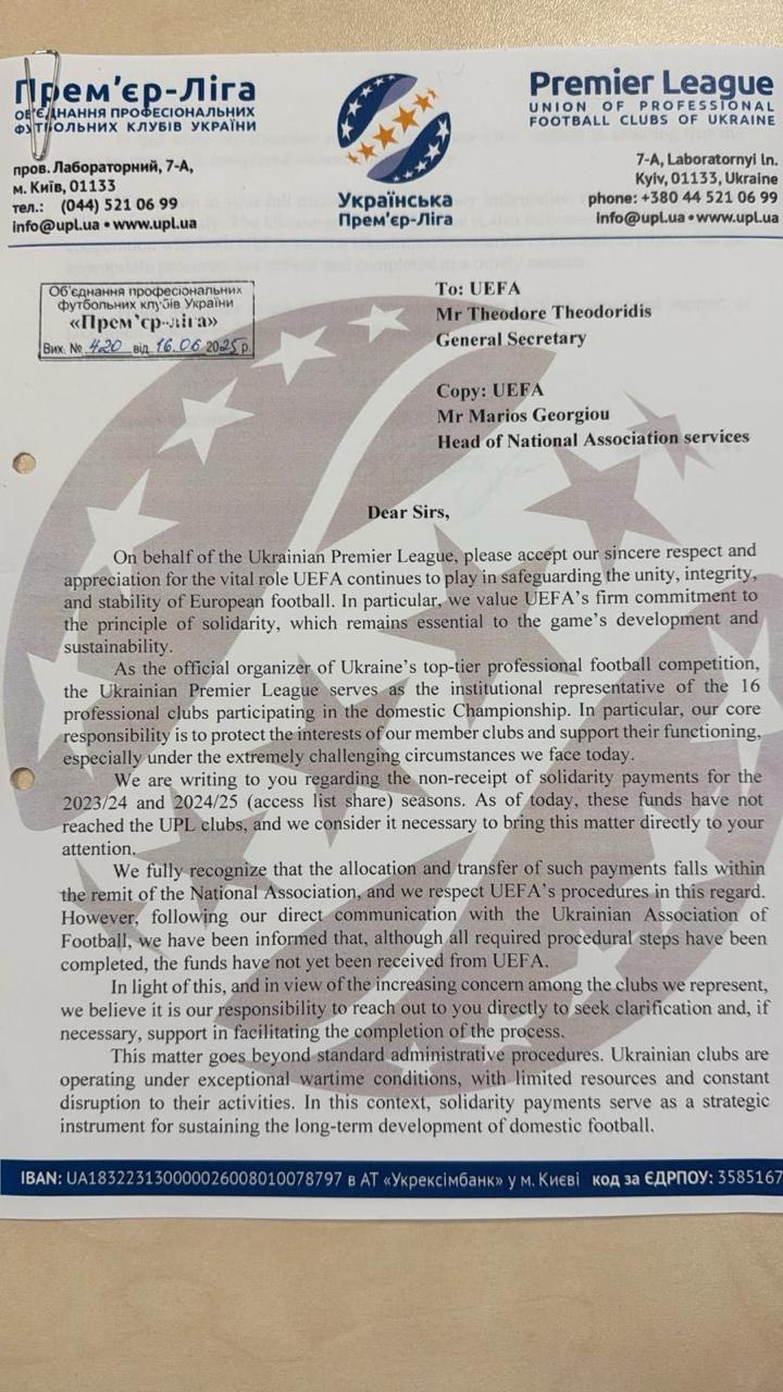 «К сожалению, по состоянию на сегодняшний день украинские клубы не получили указанные выплаты. Это вызывает удивление и глубокую обеспокоенность ввиду критических условий, в которых находится украинский футбол. Просим УЕФА как можно быстрее объяснить причины невыплат и предоставить публичную информацию об использовании средств солидарности в 2023-2024 годах».