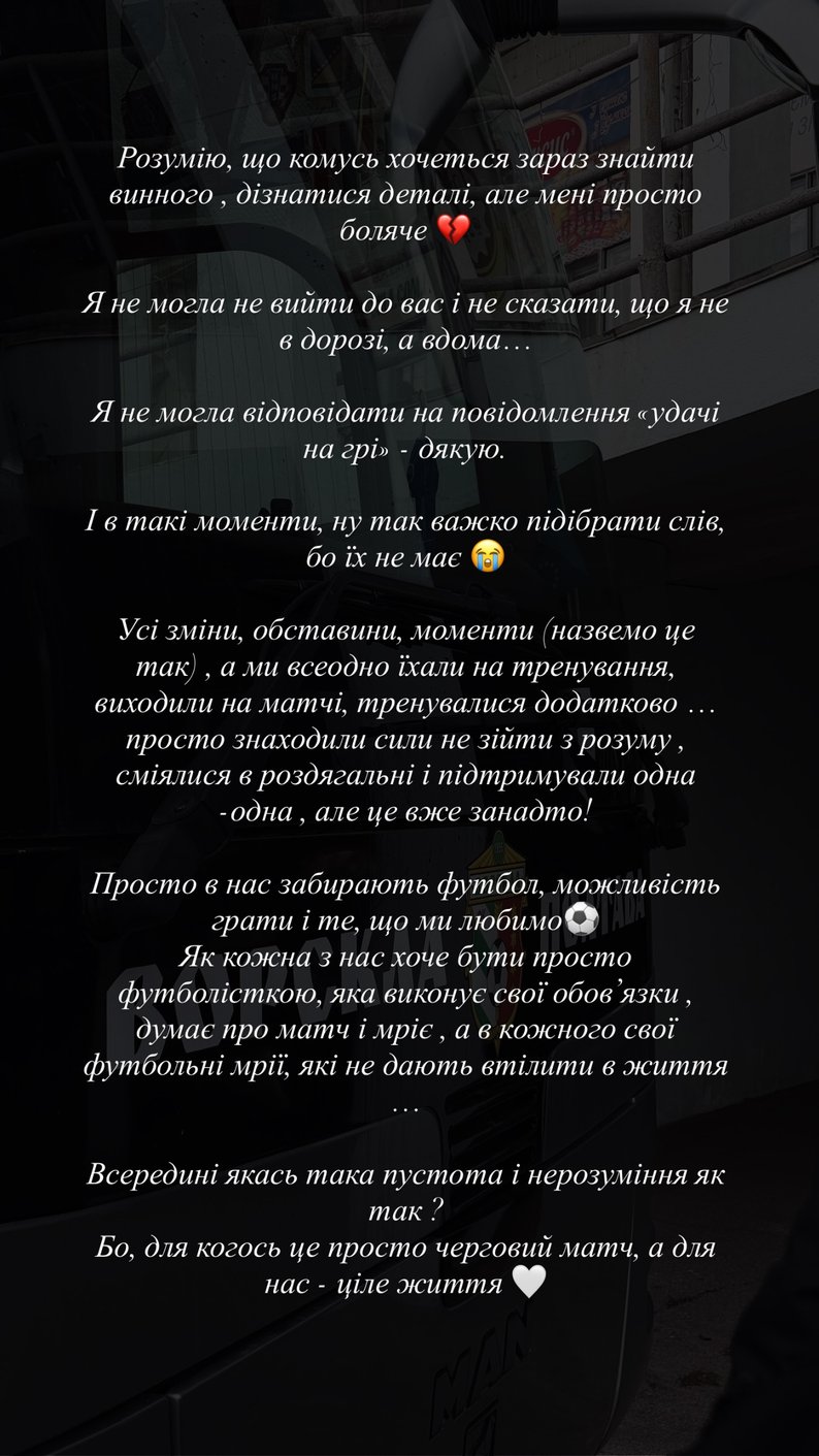 - Сегодня должен был быть день игры, но руководство полтавской «Ворсклы» пробивает дно. Команда не выехала на игру, потому что не может заправить автобус. Представить не могу, что сейчас чувствуют пришедшие на выезд игроки, а им сообщают такую "замечательную" новость. Сил вам и терпения, девушки, – написала футболистка.