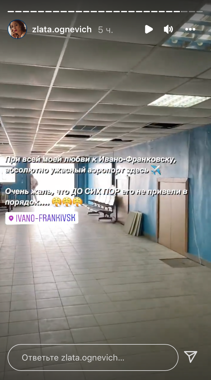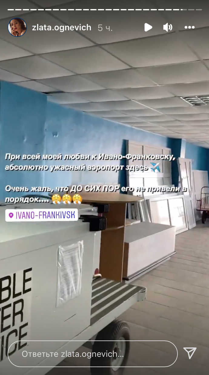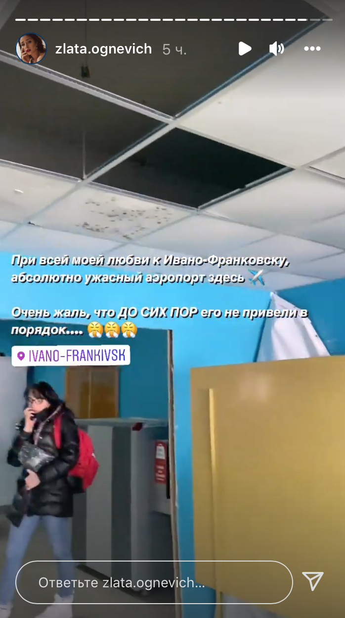 Співачка Злата Огнєвіч поскаржилася на стан міжнародного аеропорту в Івано-Франківську. В інстаграмі виконавиця показала кадри всередині будівлі та заявила, що їй дуже шкода, що аеропорт не можуть відремонтувати.