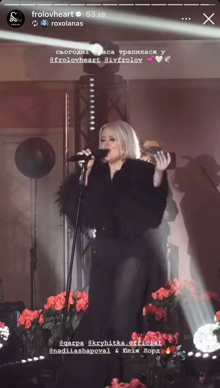 Ірена Карпа, Юлія Лорд та солістка "Крихітки" Саша Кольцова виступили на показі бренду FROLOV, який відкрив Український тиждень моди. Показ нової колекції відбувся у столичному ЦУМі, де для заходу звели подіум. Подію транслювали на сторінці бренду в Instagram та на платформі Megogo.