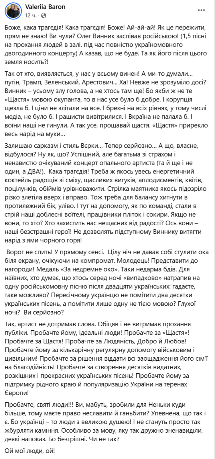 - Олег Винник заспівав російською! 1,5 пісні на прохання людей у залі під час повністю україномовного двогодинного концерту. А казав, що не буде. Та як його після цього земля носить? Так, артист не дотримав слова. Обіцяв і не витримав прохання публіки. Пробачте йому, ідеальні люди! Пробачте за щастя! Пробачте за людяність, добро та любов! Пробачте йому за багаторічну регулярну допомогу військовим та цивільним! Пробачте за рішення віддати всі заощадження його сім'ї на благодійність! Пробачте за створення десятків видатних, розкішних і прекрасних українських пісень! Пробачте йому за підтримку рідного краю й популяризацію України на теренах Європи! – написала Барон.