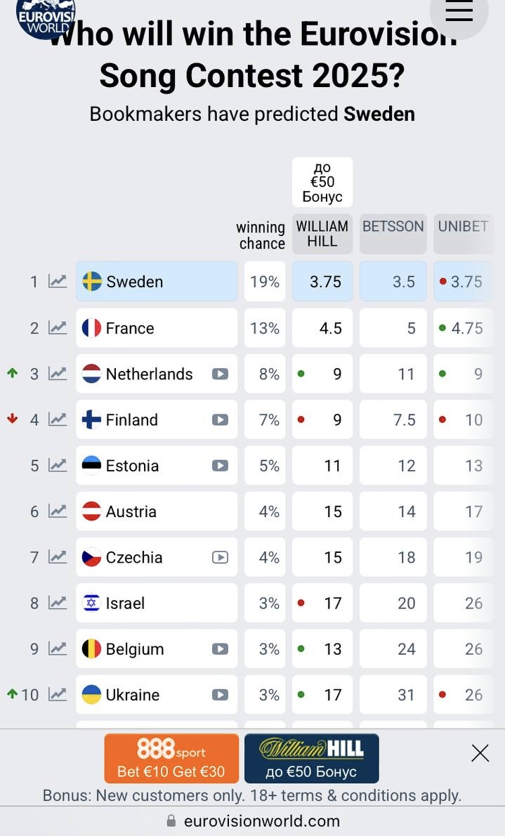 Гурт Ziferblat із піснею Bird of Pray зміцнює свої позиції на "Євробаченні-2025". Згідно з оновленими букмекерськими прогнозами, Україна повернулася до ТОП-10 рейтингу. Згідно з попередніми прогнозами на сайті eurovisionworld.com, із 37 країн-учасниць глядачі найбільше пророкують перемогу Швеції. Попри те що країна ще не обрала представника, шанс її виграшу становить 19%. Їй поступається представниця з Франції Louane, яка отримала 13% від усіх можливих ставок. Третє місце рейтингу займає співак Claude із Нідерландів (8%).