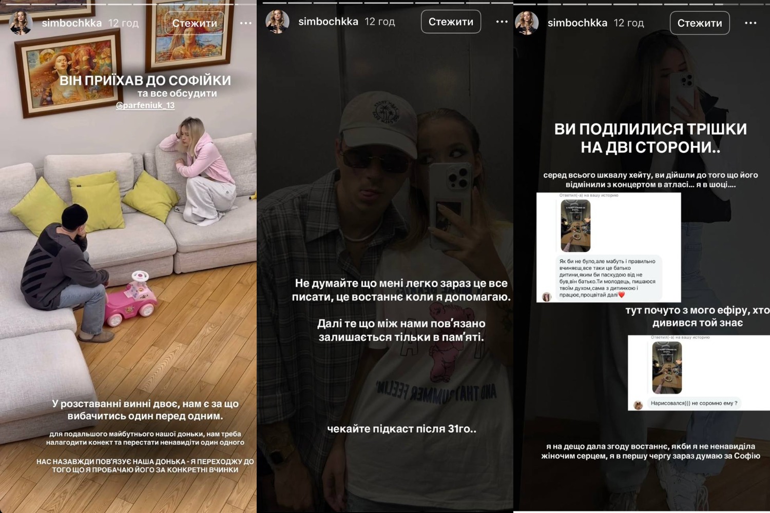 – А тепер новини за вчора. Вгадайте, хто приїхав? Тільки не поспішайте засуджувати. Вгадали. Парфенюк, він приїхав до Софійки і все обговорити. У розставанні винні двоє. Нам є за що вибачитись одне перед одним. Для подальшого майбутнього нашої дочки. Нам потрібно налагодити коннект і перестати ненавидіти одне одного. Нас завжди пов'язує дочка. Я переходжу до того, що я прощаю його за конкретні вчинки. Не думайте, що мені легко зараз це все писати, це востаннє, коли я допомагаю. Далі те, що між нами пов'язане, залишається тільки в пам'яті. Чекайте на подкаст після 31-го березня, - написала дівчина.