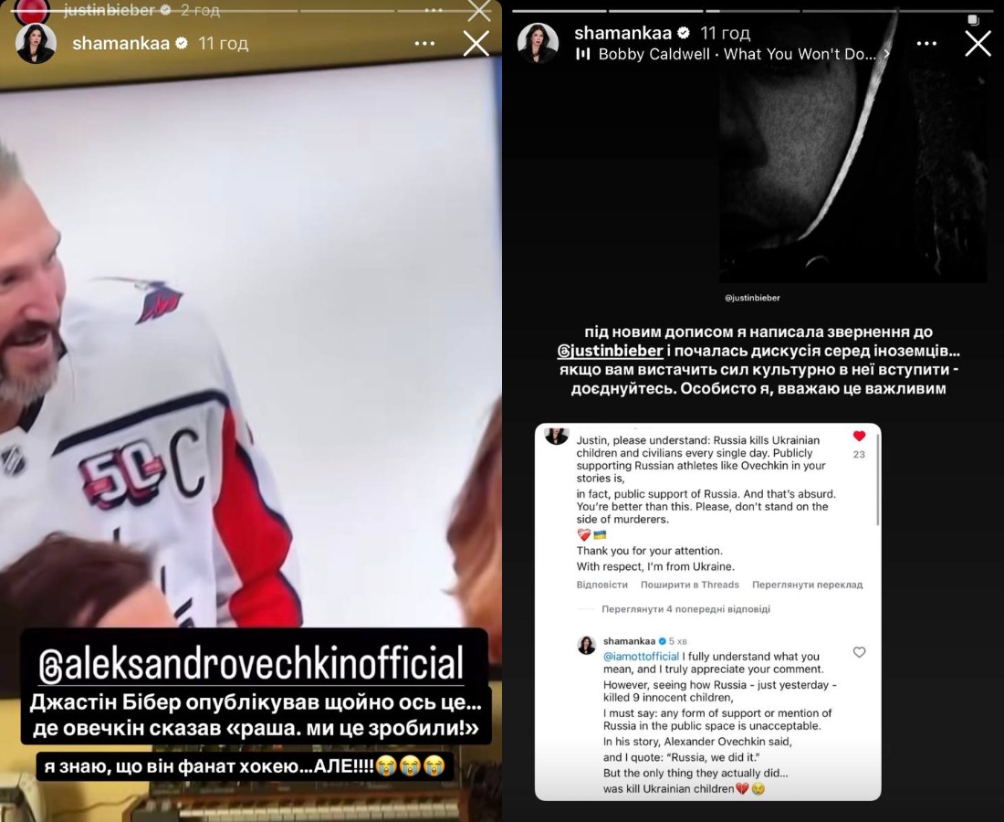 Блогер Аліна Шаманська в соцмережах звернулася до співака Джастіна Бібера, який у день жалоби за жертвами ракетного удару по Кривому Рогу захопився російським хокеїстом Олександром Овечкіним, який встановив рекорд у НХЛ із закинутих шайб. Після гри спортсмен промовив зі сцени "Росія, ми зробили це", чим обурив інфлюєнсера. У коментарях під постом артиста Шаманська зазначила, що підтримка Овечкіна з РФ - це публічна підтримка країни-агресора, і закликала його бути кращим.