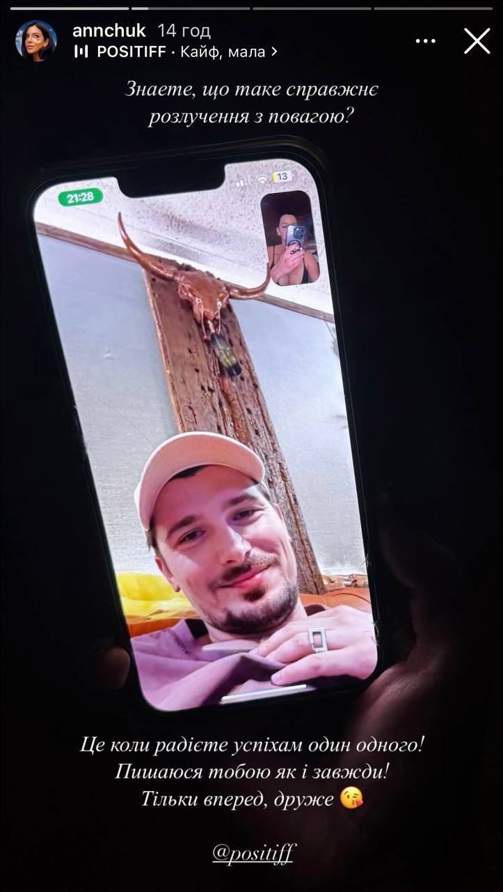 Ексдружина співака POSITIFF Анна Андрійчук зізналася, чи підтримує зв'язок із ним після розставання. Пара розлучилася у 2021 році після 13 років шлюбу, але зуміла зберегти дружні стосунки. Іноді вони навіть можуть поспілкуватися пізно ввечері. У сторис Instagram дизайнер опублікувала кадр, де розмовляє з артистом по відеодзвінку. За словами Анни, їй дуже приємно, що вони радіють успіхам одне одного. Дівчина також зазначила, що пишається виконавцем, і побажала йому рухатися тільки вперед.