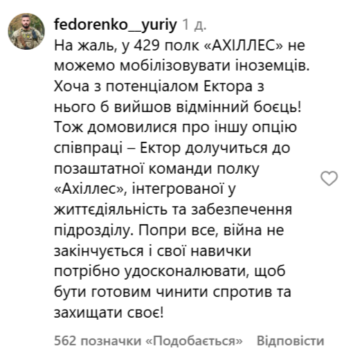 - На жаль, до 429-го полку "Ахіллес" не можемо мобілізовувати іноземців. Хоча з потенціалом Ектора з нього б вийшов відмінний боєць! Тож домовилися про іншу опцію співпраці – Ектор долучиться до позаштатної команди полку "Ахіллес", інтегрованої у життєдіяльність та забезпечення підрозділу. Попри все війна не закінчується, і свої навички потрібно удосконалювати, щоб бути готовим чинити спротив та захищати своє! - йдеться у коментарі.