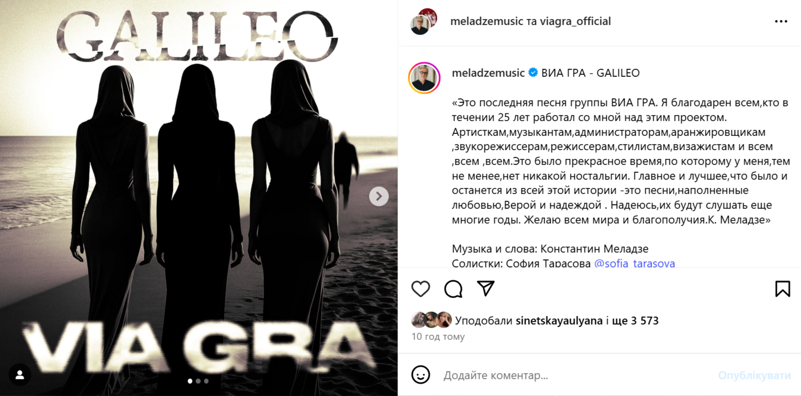 Продюсер Костянтин Меладзе закрив гурт "ВІА Гра" після 25 років роботи. Про своє рішення музикант повідомив у соцмережах, показавши фрагмент останньої пісні колективу. Вона отримала назву GALILEO. У записі треку взяли участь дві солістки останнього складу тріо - Софія Тарасова та Уляна Синецька.