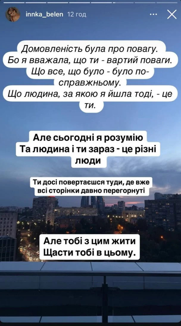 – Я довго мовчала. Ми домовилися не виносити це назовні. Але час усе розставляє по своїх місцях. Наразі я намагаюся підібрати правильні слова, щоб це описати. Цей стрибок в останній вагон перед новим сезоном. Тому що не все ж таки домусолили. І це о'кей – кожен виживає, як може. В історії цієї людини я - ху**ва. І навіть о'кей, що це нав'язується аудиторії. І робити з себе жертву теж нормально начебто. Навіть коли ти чоловік. Домовленість була про повагу. Тому що я вважала, що ти вартий поваги. Що все, що було, було по-справжньому. Що людина, за якою я тоді йшла, це ти. Але сьогодні я розумію: та людина і ти зараз – це різні люди. Ти й досі повертаєшся туди, де вже всі сторінки давно перегорнуті. Але тобі із цим жити. Успіху тобі в цьому, - заявила Бєлєнь.
