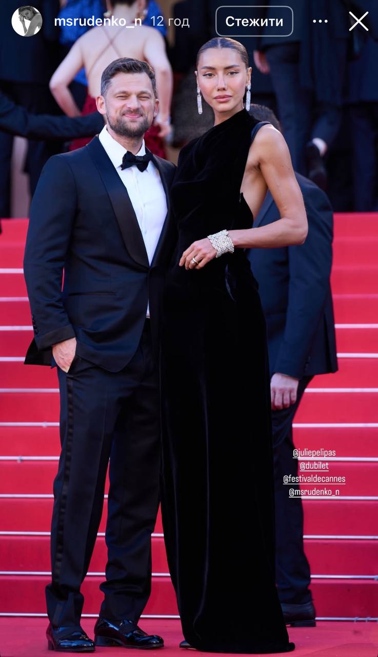Засновниця бренду BETTTER Юлія Пелипас приїхала до Канн разом із чоловіком-бізнесменом Дмитром Дубілетом. Для виходу на червону доріжку Пелипас обрала чорну сукню ALAÏA і туфлі від Phoebe Philo.