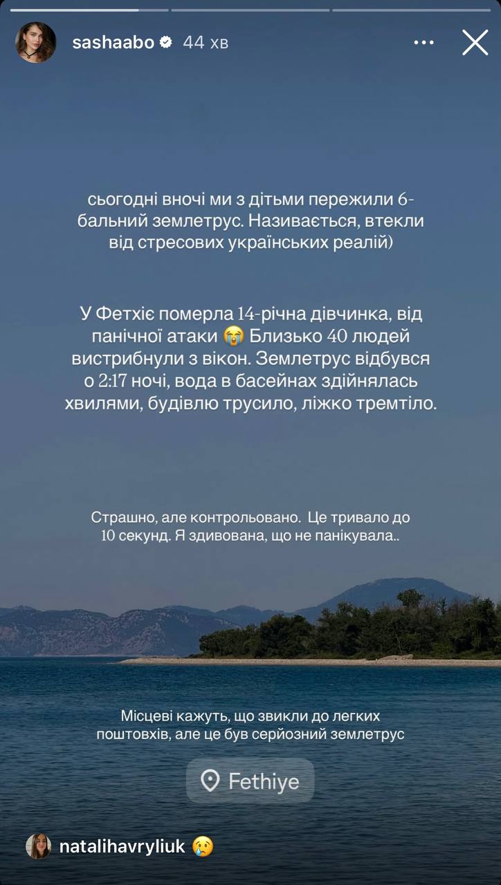 Блогер Саша Бо опинилася в епіцентрі землетрусу в Туреччині, куди виїхала на відпочинок разом із дітьми. У місті Фетхіє, де наразі перебуває родина, стався землетрус, силу якого оцінили майже в 6 балів за шкалою Ріхтера. За словами інфлюенсера, сильні поштовхи почалися вночі і тривали близько 10 секунд. У цей час вода в басейнах піднімалася хвилями, будівлю хитало, а їхнє ліжко трусило.