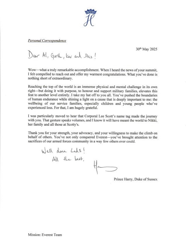 - Вау, яке чудове досягнення! Досягнення вершини світу саме по собі є величезним фізичним та розумовим випробуванням, але зробити це з метою вшанувати та підтримати сім'ї військовослужбовців піднімає цей подвиг на зовсім новий рівень. Я знімаю перед вами капелюха. Ви розсунули межі людської витривалості та привернули увагу до справи, яка для мене дуже важлива, – благополуччя сімей військовослужбовців, особливо дітей та молодих людей, які пережили втрату. За це я вам дуже вдячний. Ви не лише підкорили Еверест, але й привернули увагу до жертв наших збройних сил так, як це вдалося небагатьом. Молодці, хлопці. Усього вам найкращого, – написав у зверненні син короля Чарльза ІІІ.