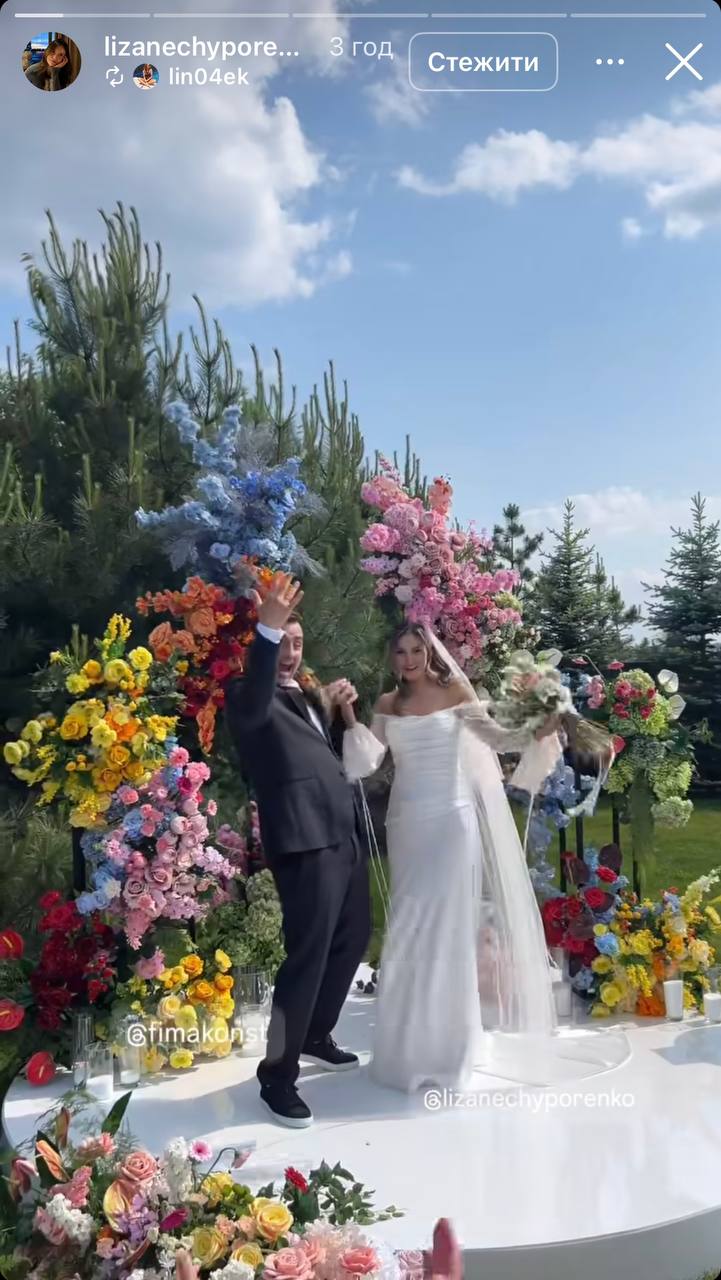 Телеведучий та комік Фіма Константиновський та його кохана Єлизавета, які кілька днів тому розписалися після двох з половиною років стосунків, зіграли весілля. Свято пари пройшло напередодні просто неба. Радісною новиною молодята поділилися в соцмережах, опублікувавши знімки з весілля.