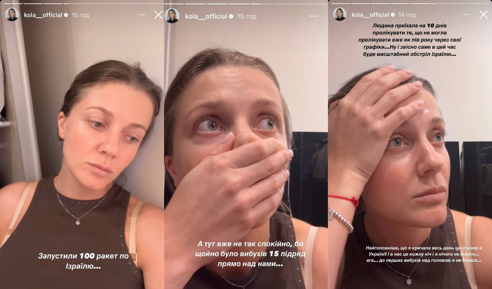 Співачка KOLA опинилася в епіцентрі ракетного обстрілу Ірану по Ізраїлю. Про це артистка повідомила в сторіс Instagram, показавши кадри з укриття.