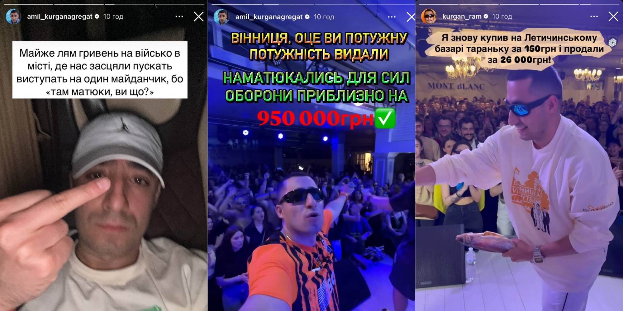 - Майже 1 мільйон гривень на війська у місті, де нас засц*ли пускати виступати на один майданчик, бо "Там матюки, ви що?", - зазначив соліст групи Аміл Насіров, показавши середній палець.
