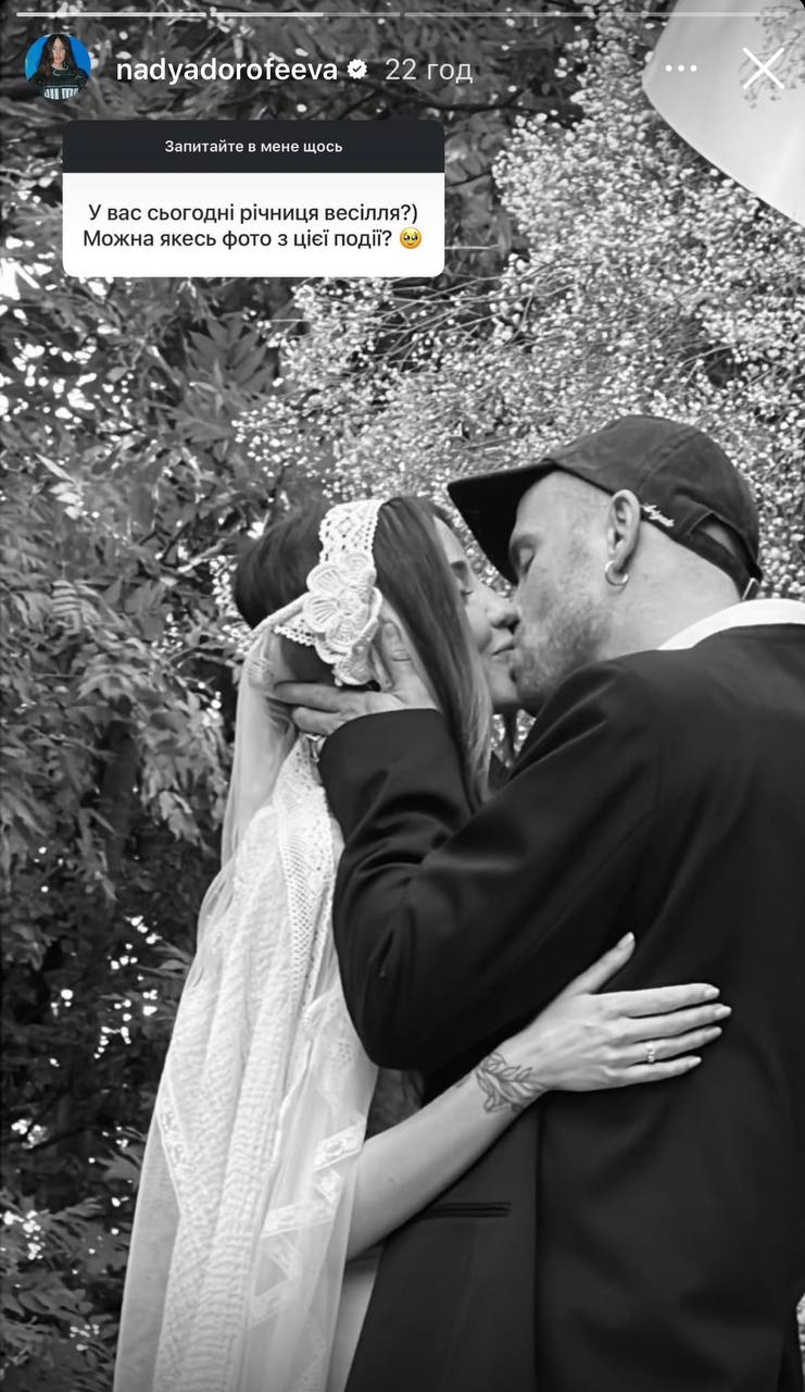 Співачка Надя Дорофєєва та ресторатор Міша Кацурін напередодні відзначили важливу дату - два роки тому, 15 червня, закохані одружилися. З нагоди річниці шлюбу, артистка поділилася у сторис Instagram архівним знімком з весілля пари. На чорно-білому фото Дорофєєва та Кацурін цілуються, обіймаючи одне одного.