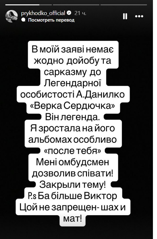 Також Приходько опублікувала у своєму сторієз скриношт, зроблений з сайтів новин, на якому Державне агентство України з питань мистецтв офіційно підтвердило, що Віктор Цой не включений до чорного списку України. Там згадується, що покійний артист не був громадянином РФ і його пісні не підлягають забороні в нашій країні.