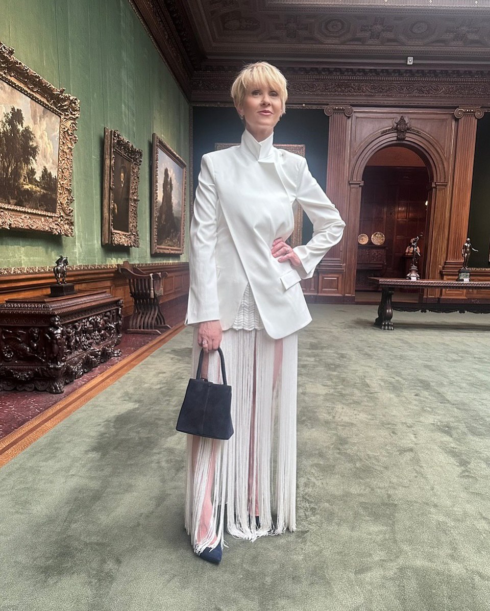 Зірка серіалів "Секс у великому місті" й "І просто так..." Синтія Ніксон з'явилася на публіці у вбранні від українського дизайнера. Артистка приміряла білий жакет навхрест за 30 500 гривень та сукню з бахромою Maryna від BEVZA, яку доповнила туфлями-човниками темно-синього кольору та сумочкою в тон. Про це повідомляється на офіційній сторінці бренду в Instagram.