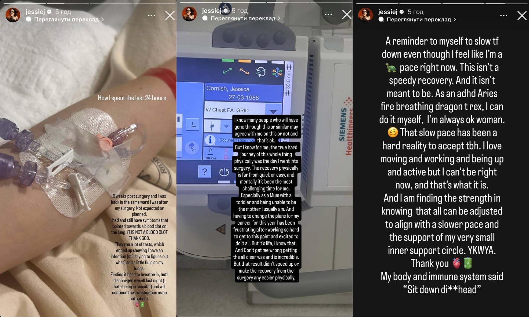 - Через 6 тижнів після операції я знову опинилася у тій самій палаті, що й після операції. Я на це не очікувала і не планувала. У мене були досі симптоми, які вказували на тромб в легенях. Але, дякувати Богу, це не він, - написала виконавиця.