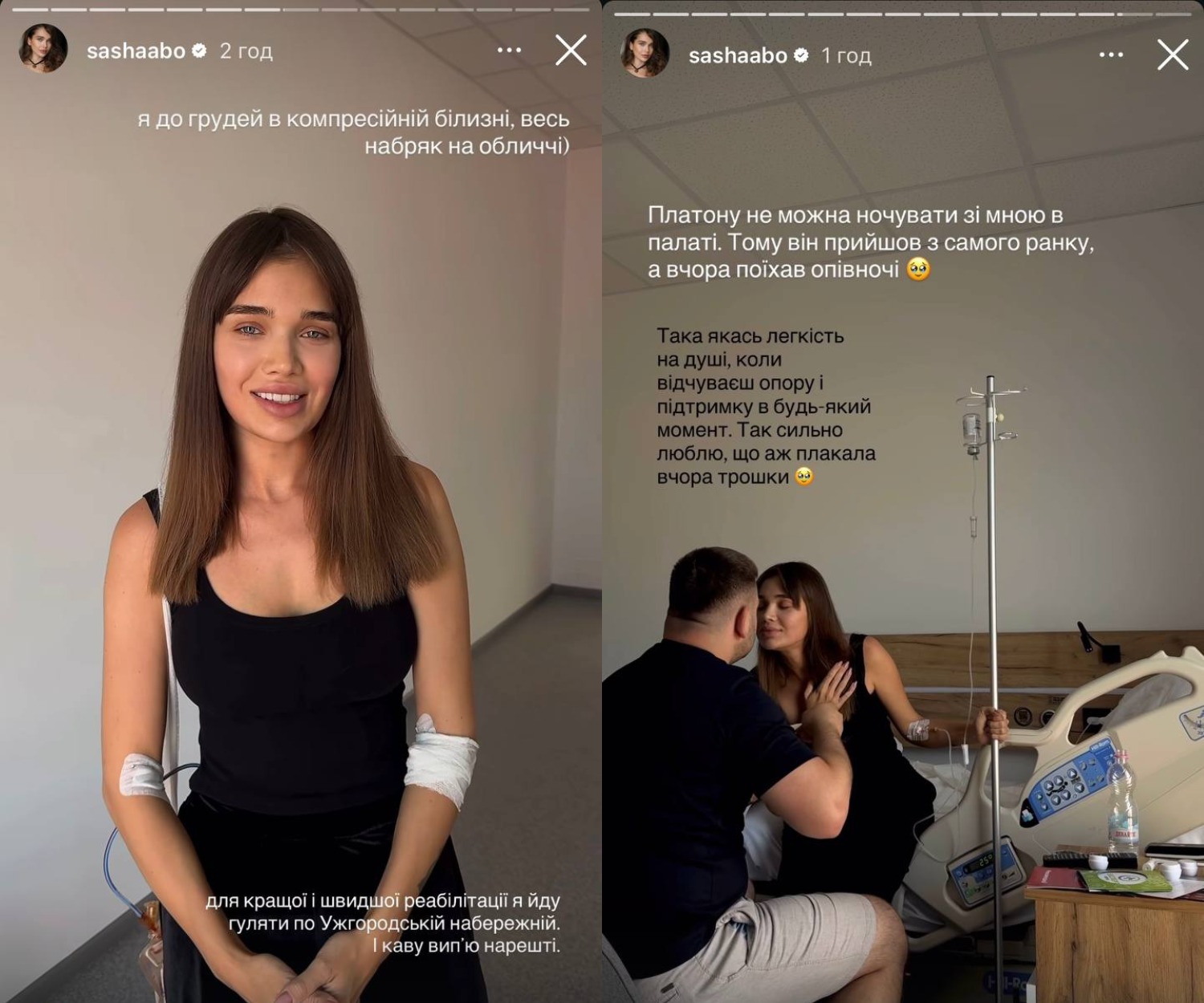 У сторіс Instagraam Бо опублікувала кадри, де вона в компресійних панчохах та білизні, а також із трубками після перенесеного хірургічного втручання. Крім того, дівчина показала як чоловік, стоматолог Платон Тарнавський, годує її після операції.