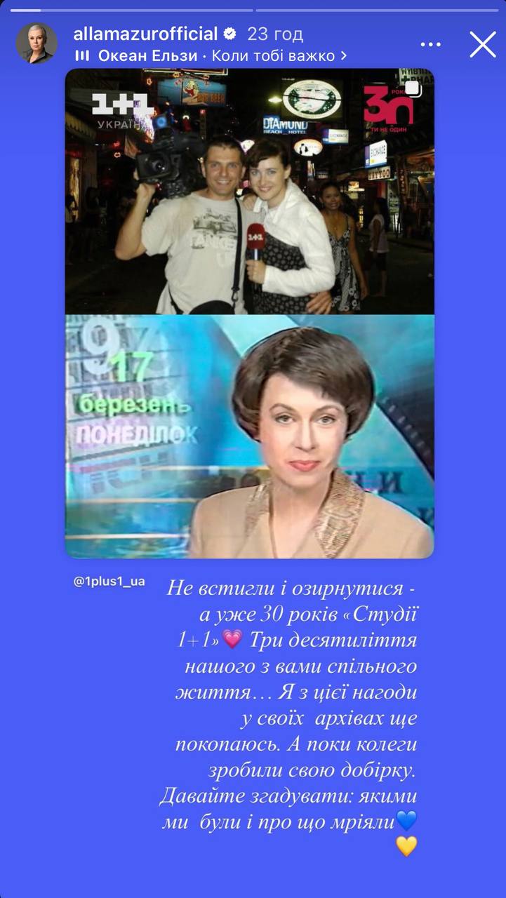 Одна з перших телеведучих на телеканалі Алла Мазур зробила репост повідомлення "1+1" і закликала колег згадати про те, якими вони були в період початку роботи в штаті мовника і про що мріяли.
