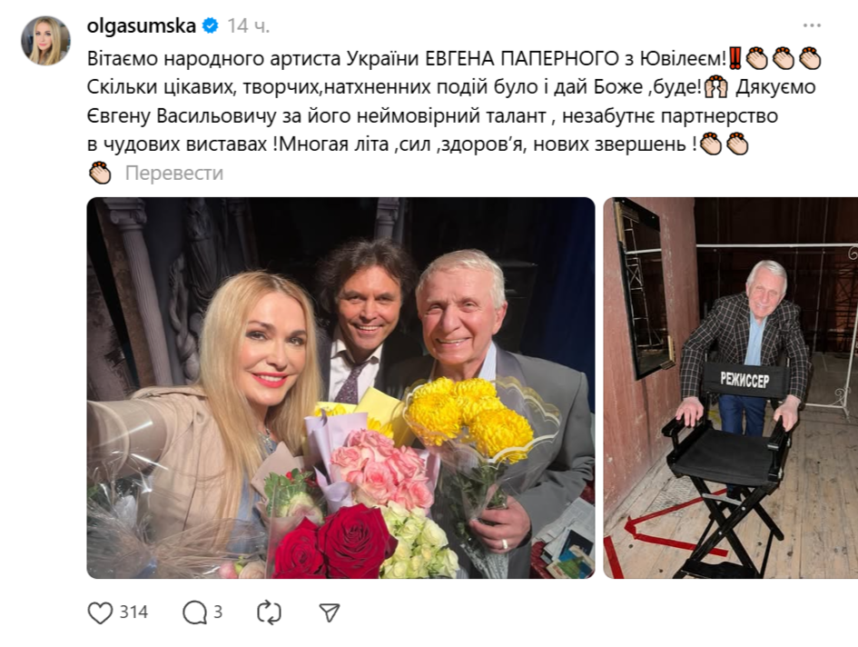 – Вітаємо народного артиста України ЕВГЕНА ПАПЕРНОГО з ювілеєм! Скільки цікавих, творчих, натхненних подій було і, дай Боже, буде! Дякуємо Євгену Васильовичу за його неймовірний талант, незабутнє партнерство у чудових виставах! Многая літа, сил, здоровʼя, нових звершень! - написала у Threads актриса.