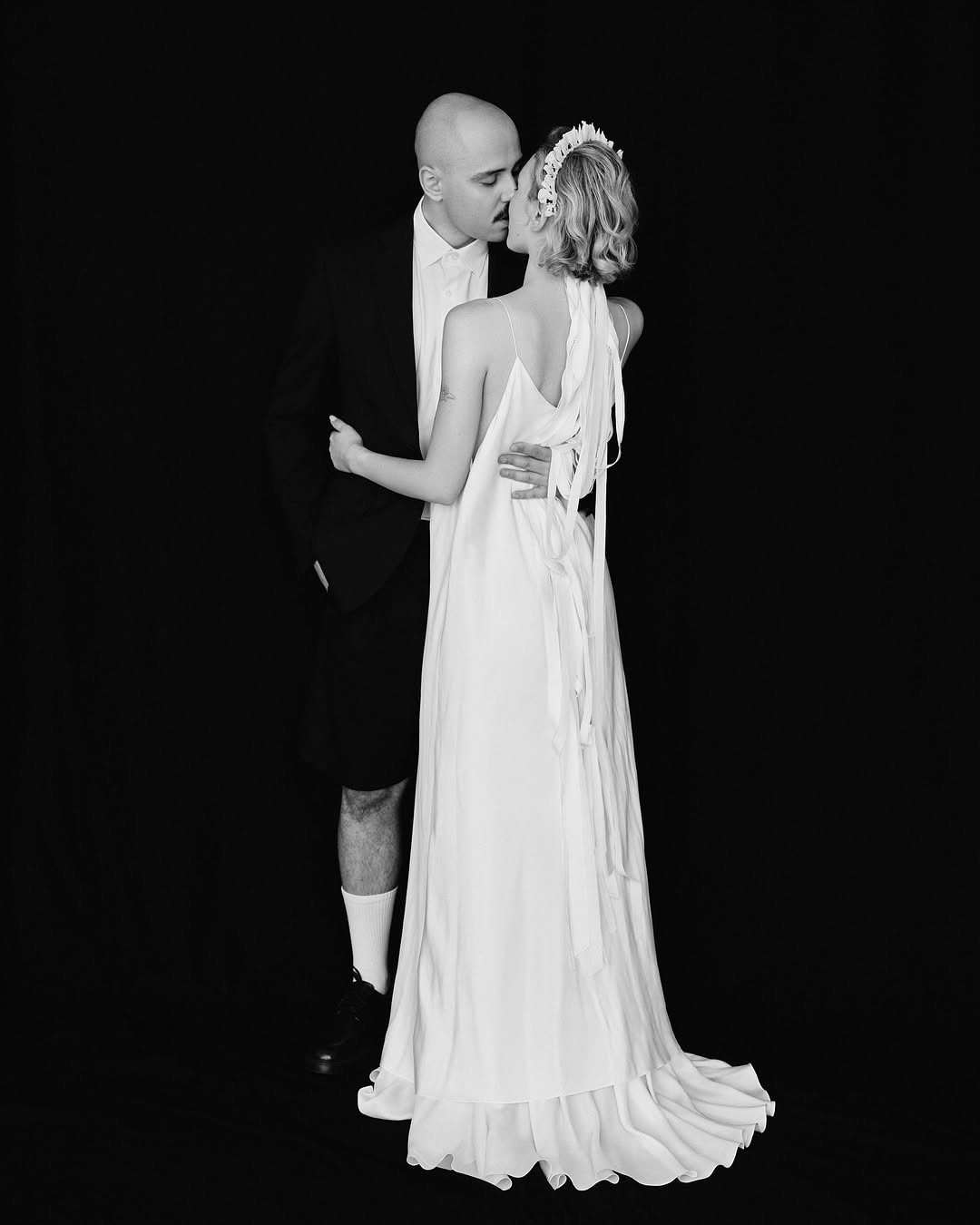 На знімках пара позує обійнявшись у весільних образах - наречена обрала білу сукню з вінком, а виконавець був у костюмі зі шортів, піджака та сорочки.