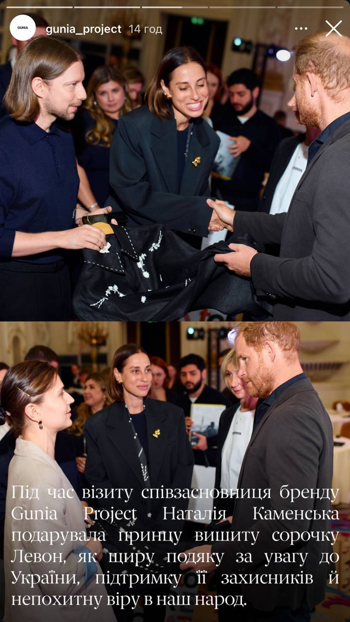 Під час візиту до Києва принцу Гаррі подарували чорну вишиванку з його ініціалами від GUNIA Project. Сорочку передала особисто співзасновниця бренду Наталія Каменська. Про це йдеться в інстаграмі Gunia.