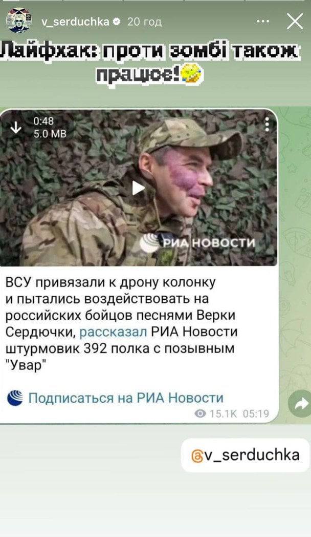 У відповідь на це артист виклав у соцмережах сторіс зі скріншотом інтерв'ю окупанта і підписав: "Лайфхак: проти зомбі також працює".