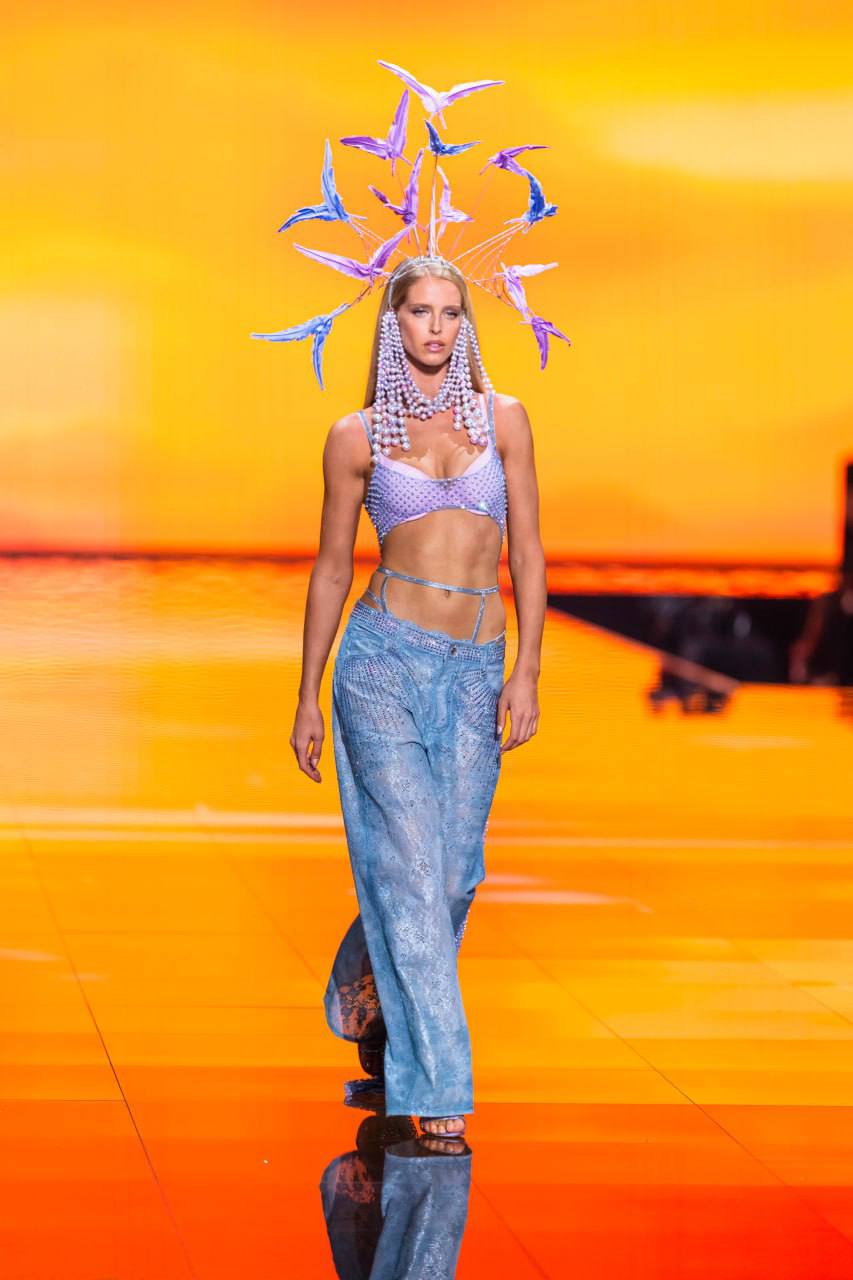 Відкривати показ довірили вагітній моделі Жасмін Тукс. Вона вийшла на подіум з декоративним корсетом у вигляді мушлі і з безліччю лампочок, який доповнював сітчастий купальник, що підкреслював її округлий животик.