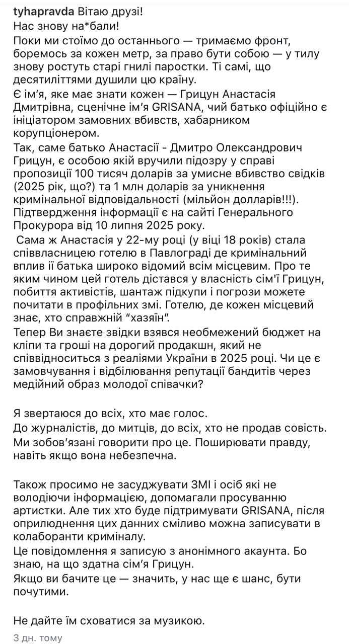 Учасниця Нацвідбору-2025 співачка Grisana заявила, що її творчість фінансують партнери, не пов'язані з родиною. Так артистка відреагувала на чутки, що її батьком є відомий у Дніпрі адвокат і "кримінальний авторитет" Дмитро Грицун. Чи дійсно це її батько, Grisana не підтвердила, і не спростувала.