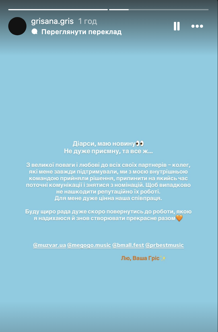 - З великої поваги та любові до всіх своїх партнерів і колег я разом із внутрішньою командою ухвалила рішення тимчасово припинити поточні комунікації та знятися з номінацій, щоб випадково не нашкодити репутації їхньої роботи, - повідомила співачка.