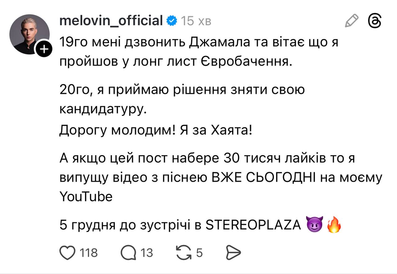 - 19-го мені дзвонить Джамала та вітає, що я пройшов у лонгліст "Євробачення". 20-го я ухвалюю рішення зняти свою кандидатуру. Дорогу молодим! Я за Хаята! - написав Меловін.