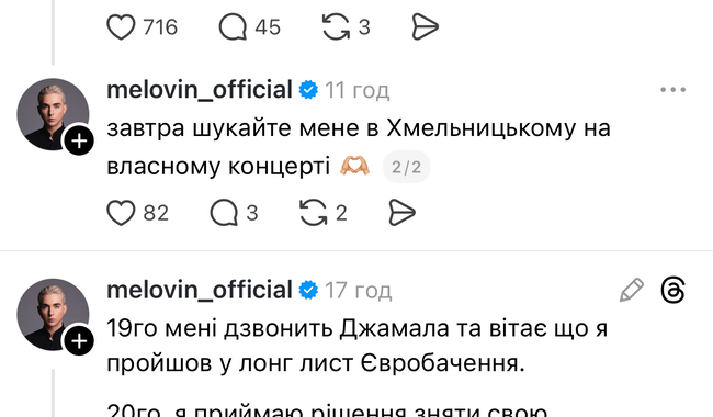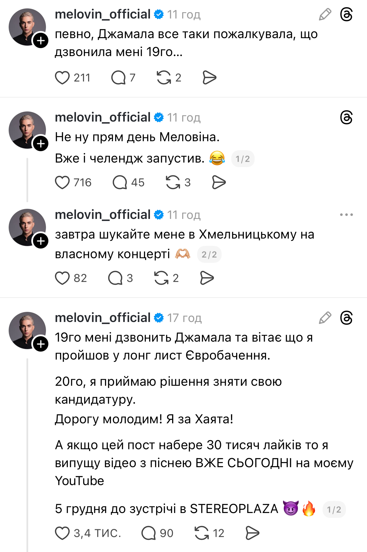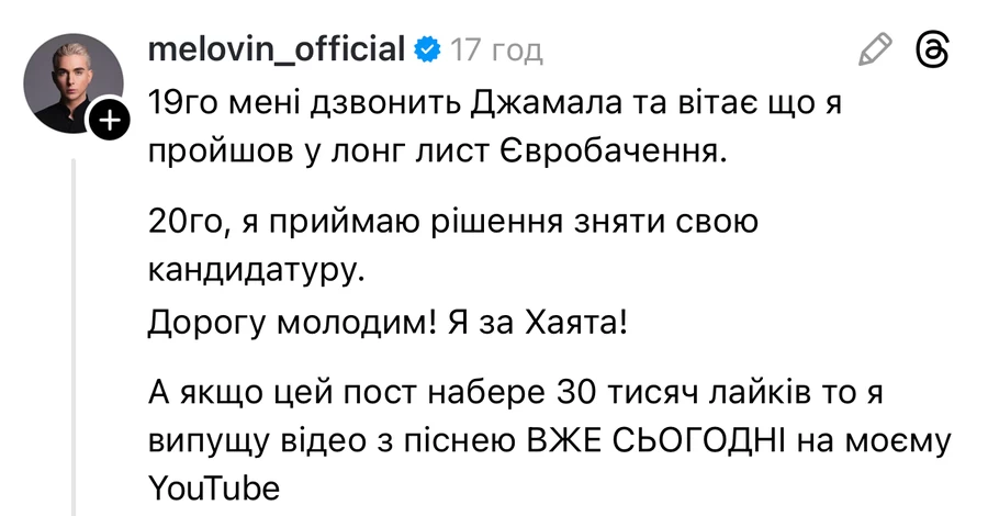 Приводом для жартів також стала фраза Меловіна, що він знімається з Нацвідбору, щоб дати дорогу молодим, зокрема співаку KHAYAT. Іронія в тому, що їм обом по 28 років.