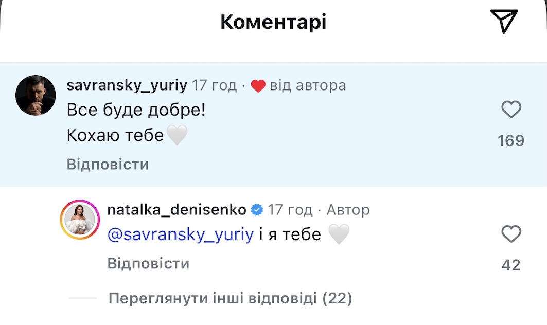 «Все буде добре! Кохаю тебе», - написав Савранський. Акторка відповіла: «І я тебе». Денисенко і Савранський разом працювали над рекламою ювелірного бренду акторки, а у листопаді засвітилися на концерті Артема Пивоварова у Києві.