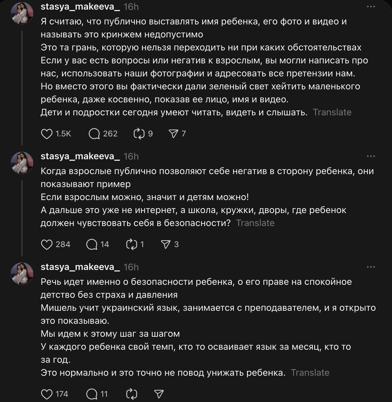 - Жодній мамі і жодному ворогові не побажаю, щоб булили їхніх дітей! Я вважаю, що публічно виставляти ім'я дитини, її фото та відео і називати це крінжем неприпустимо. Це та грань, яку не можна переходити за жодних обставин. Якщо у вас є питання чи негатив до дорослих, ви могли написати про нас, використовувати наші фотографії та адресувати усі претензії нам. Але натомість ви фактично дали зелене світло хейту маленької дитини, навіть якщо побічно, показавши її обличчя, ім'я та відео. Діти та підлітки сьогодні вміють читати, бачити й чути, - написала Макєєва у Threads.