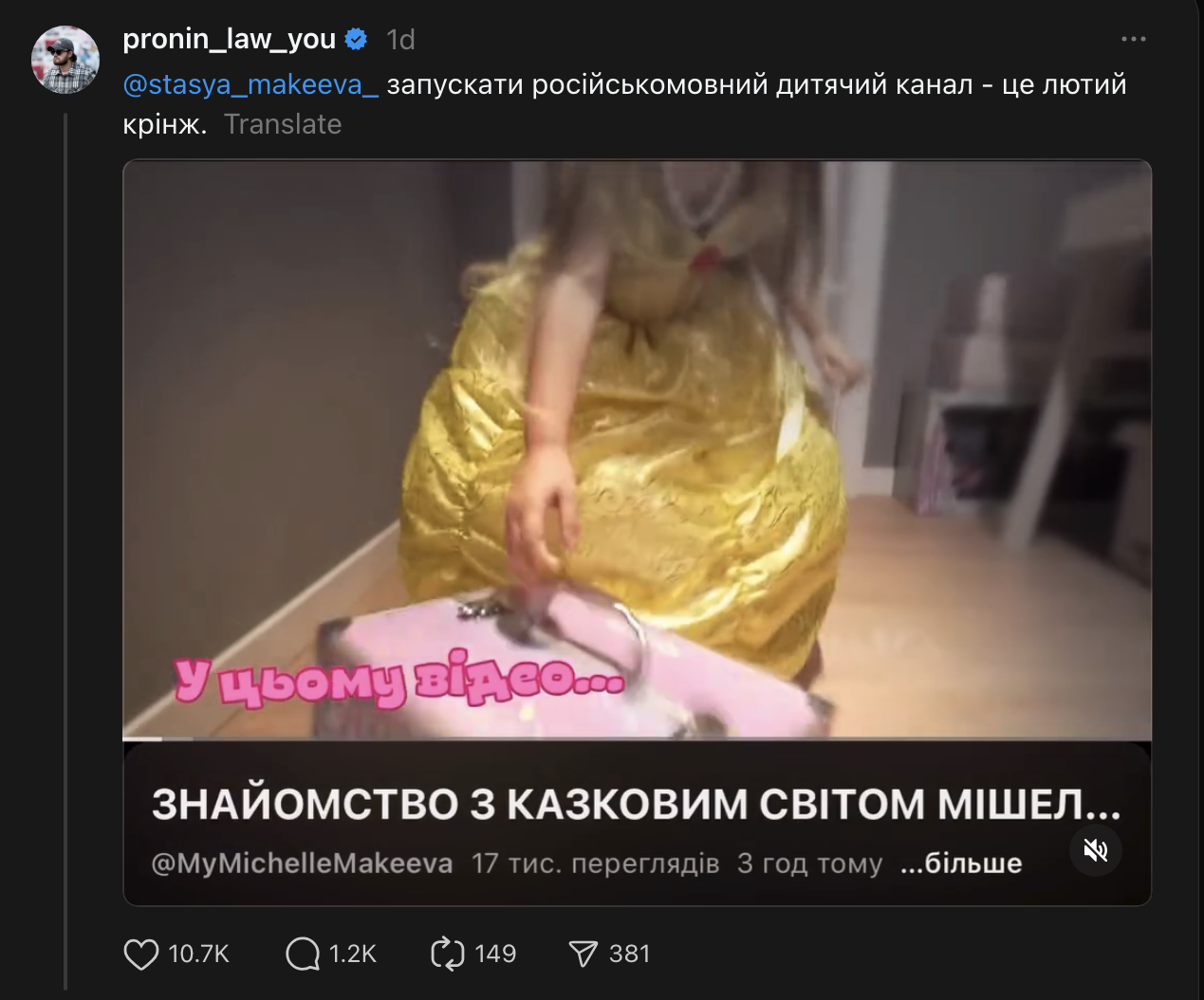 Українська блогерка-мільйонниця Стася Макєєва поскаржилась на булінг своєї 4-річної доньки Мішель через запуск російськомовного YouTube-каналу.
