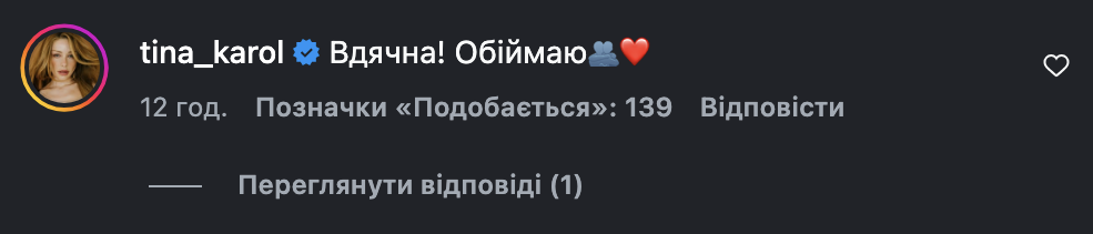 "Тіна Кароль, обіймаю! Тримаємо стрій!", - констатувала Полякова. У відповідь Тіна написала: "Вдячна! Обіймаю".