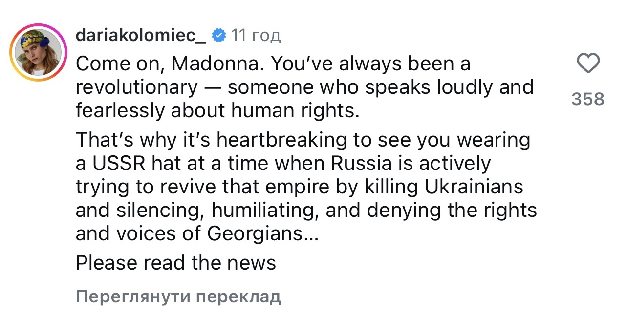 - Та годі, Мадонно. Ти завжди була революціонеркою — людиною, яка голосно та безстрашно говорить про права людини. Ось чому так боляче бачити тебе в капелюсі СРСР у той час, коли Росія активно намагається відродити цю імперію, вбиваючи українців та змушуючи замовчувати, принижуючи та заперечуючи права та голоси грузинів…Будь ласка, прочитайте новини, - написала українська блогерка Даша Коломієць.