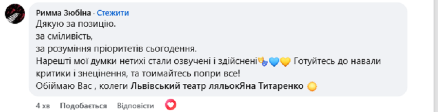 Підтримала таке рішення й відома акторка Римма Зюбіна. Вона подякувала колективу театру за позицію та сміливість.